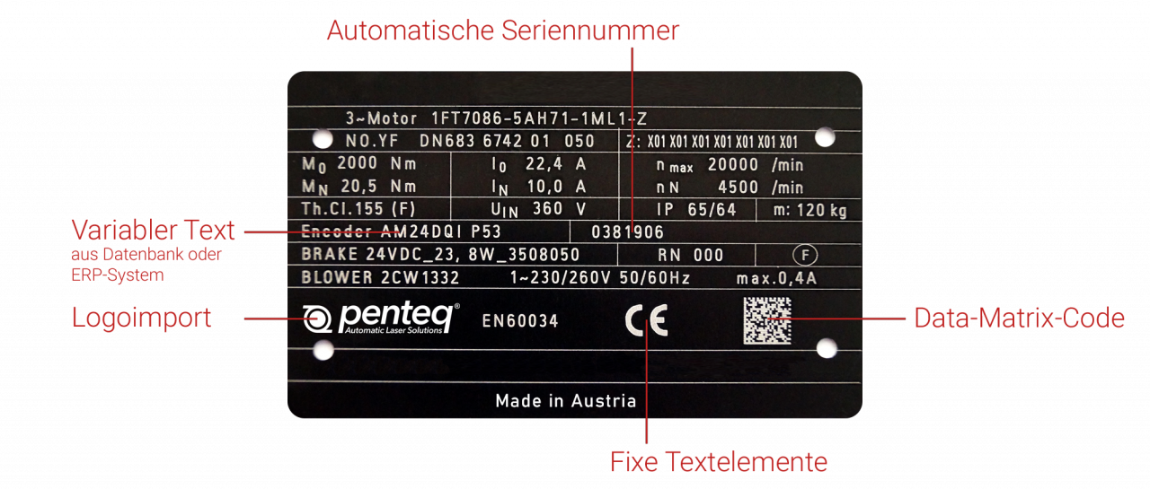 Mit Lasersystemen von Penteq profitieren Sie von einer exzellenten Beschriftungsqualität auf nahezu jedem Material. Unsere Laser eignen sich perfekt, um Typenschilder klar und dauerhaft zu beschriften. Dabei stehen Ihnen verschiedene Verfahren wie Gravur, das Abtragen von Eloxal- und Farbschichten oder das präzise Entfernen der Oberfläche zur Verfügung.