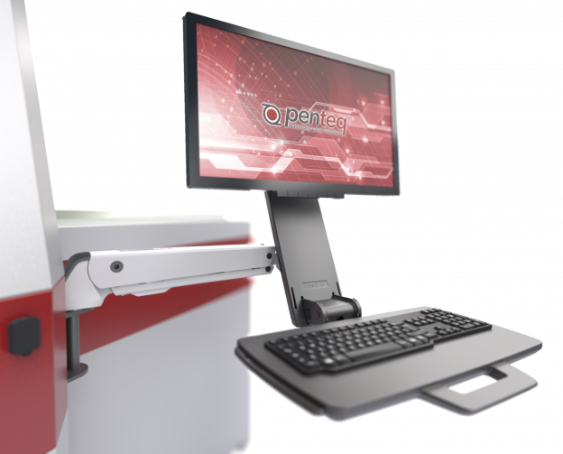 Bildschirm, Tastaur und Maus sind auf einem ergonomisch in Höhe und Neigung einstellbaren, soliden Schwenkarm aufgenommen.
