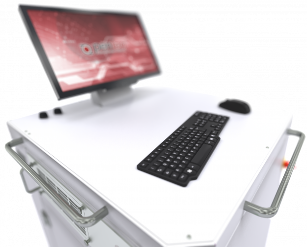 Die durchdachte Konstruktion des Systems bietet eine großzügige Tischfläche zur Aufnahme des Bildschirmes und Auflage von Maus und Tastatur. Dadurch wird eine einfache Erstellung oder Bearbeitung der Beschriftungslayouts direkt am System ermöglicht. Eine externe Vorbereitung ist nicht nötig.