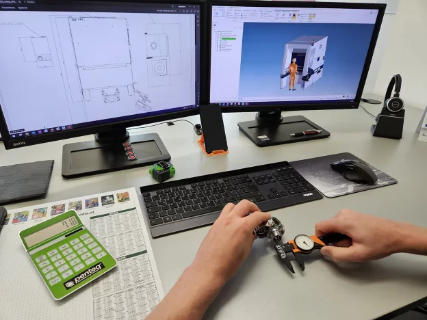 Mit einer speziell für High-Tech Maschinenbau entwickelten 3D-CAD Software entwickeln unsere erfahrenen Konstrukteure Laser, Maschinen- und Anlagenlösungen sowie Vorrichtungen und Aufnahmen. Die Erstellung eines "digitalen Zwillings" ermöglicht es uns schon in der Entwurfsphase mögliche Probleme zu erkennen und zu vermeiden.