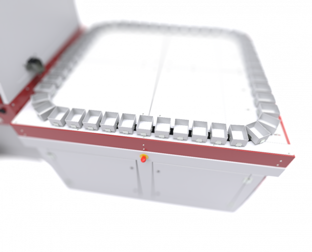 The special design of the ring conveyor enables permanent access to the sorting boxes. Rush or test orders can also be produced manually in between. The system also has an automatic front door, which can also be used for labels with special formats.