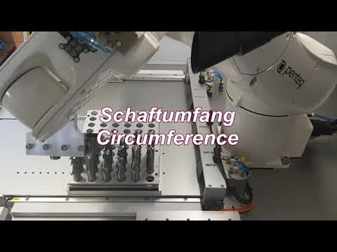 Laserbeschriftungssystem für Hartmetallwerkzeuge, Fräswerkzeuge. Automatisches Lasergravursystem mit vollständig intergriertem 6-Achs Roboter für hochflexible Laserbeschriftungen am Schaftumfang oder an der Schaftstirnseite. Das innovative Konzept des Doppelauszugtisches ermöglich die Be/Entladung der Werkstückpaletten während der Laserbearbeitung und realisiert damit höchste Produktivität;