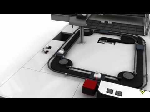 Automatic laser marking, laser engraving and laser processing with sorting on shuttle table and robot using the example of die-cast parts. The workpieces are loaded by the robot from the pallet onto the conveyor belt of the system and then laser-marked with plain text and Data Matrix codes and subsequently tested with an integrated vision system. The bad parts are removed and the finished workpieces are placed on a shuttle table for removal.