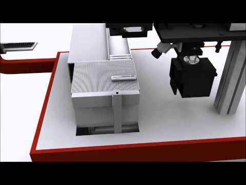 Automatisch Laserbeschriften, Lasergravieren und Laserbearbeiten mit Sortierung auf Wechseltisch und Roboter am Beispiel von Druckgussteilen. Die Werkstücke werden vom Roboter von der Palette auf das Förderband der Anlage eingelegt und anschließend mit Klarschrift und Data Matrix Codes laserbeschriftet und in weiterer Folge mit einem integriertem Vision System geprüft. Die Schlechtteile werden ausgeschleust und die fertigen Werkstücke auf einem Wechseltisch zur Entnahme abgelegt.